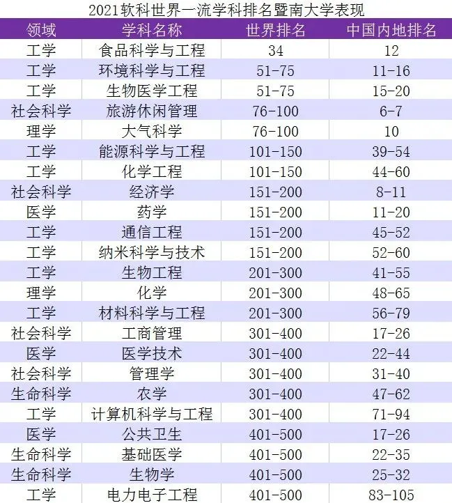 暨南大学共有23个学科 进入世界一流学科榜单 上榜学科数量位列 一流学科建设高校第1名 内地高校第28名 暨南大学上榜学科分别为食品科学与工程、环境科学与工程、生物医学工程、旅游休闲管理、大气科学、化学工程、经济学、药学、通信工程、纳米科学与技术、生物工程、化学、材料科学与工程、医学技术、管理学、农学、计算机科学与工程、电力电子工程、能源科学与工程、工商管理、公共卫生、基础医学以及生物学,最后5个学科为2021年新上榜学科。
