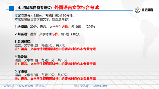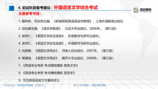 暨南大学专业课满分是150,考试时间是3小时。试卷是包括:语言学和文学的题目,都在一张试卷上。重点讲一下论述题,论述题跟简答题一样,就是写的字要多一点,然后最好提出你的个人观点,这样子分数才会高一点。 下面列出我初试期间用到的专业课参考书目: