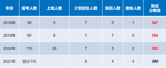 首先,我想给大家看一下这个表格,大家可以清晰的看到。就是各个年份的报考人数,上线人数,计划招生人数,统招人数和推免人数,以及复试分数线。