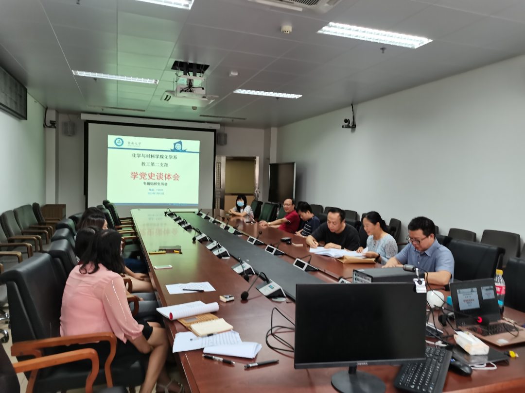 7月13日下午,化材院化学系教工第二党支部以“线下+线上”相结合的方式,召开“学党史谈体会”党史学习教育专题组织生活会。学校督导组成员、国际商学院党总支书记滕斌线上全程参加专题组织生活会并作指导。化学系教工第二党支部14名党员出席会议,会议由支部书记冯鹏举同志主持。