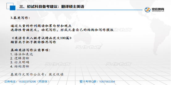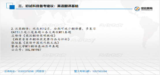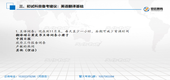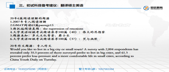 1.单项选择 单词一般花40min-1h去记忆,平时的话也要去注重外刊的一个外刊的一个阅读,这是一定要去阅读双语的,因为外刊里面有很多文化背景知识,或者说一些隐含的意思。你只读英文,未必能够读懂,所以要去看中文,去看对应的翻译,在这个过程中,他对于提高你的翻译能力也是有帮助的。另外,暨大喜欢去考一些改错题,就是把改错题改变为选择题,所以大家可以关注一下,还有一些GRE的词汇辨析题,去辨识一些词汇。