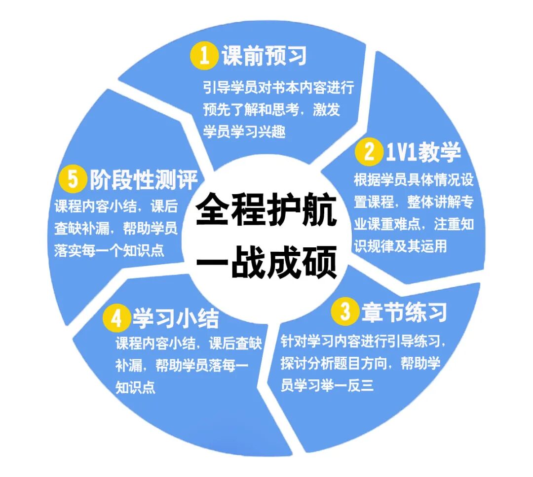 一对一辅导是根据考生实际情况而量身定制。课程采取特色双师服务,教务老师+高分学霸老师,“高分直系学长学姐”一对一专业高效辅导,教务老师全程跟踪管理,实时解答学员学习问题及安排课程。