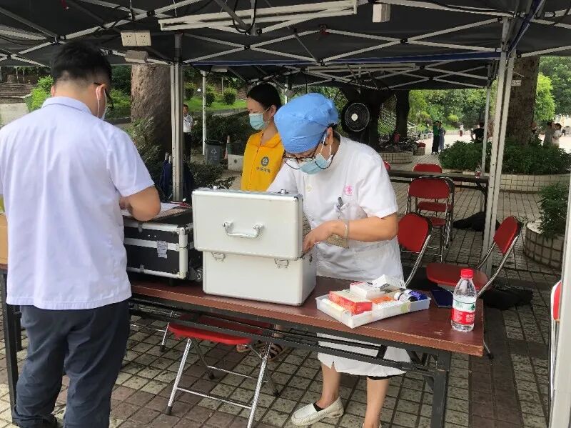 训练场上,教官和同学们挥汗如雨,训练场后方,中医学院岐黄青年志愿者服务队不辞辛劳,医疗服务6000多名新生,确保训练工作得以顺利进行。医疗服务队在石牌校区、番禺校区分别设置军训医疗救护点,还配置医疗组、辅助组。医疗服务队配备药箱,以及藿香正气水、创可贴、碘伏、棉签、云南白药等各类防中暑、急救药品,若有同学发生滑倒、中暑、流血不止等突发情况,都能够得到及时处理。岐黄志愿者服务队还为新生们免费提供葡萄糖水,为低血糖同学及时供给能量。