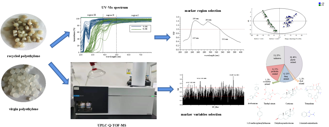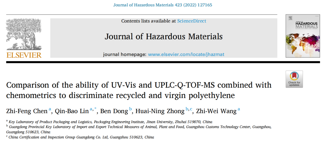 近日,包装工程学院硕士研究生陈智峰同学的研究论文Comparison of the ability of UV-Vis and UPLC-Q-TOF-MS combined with chemometrics to discriminate recycled and virgin polyethylene在国际著名期刊Journal of Hazardous Materials(影响因子10.588,中科院1区,top期刊)上发表。该期刊是危险材料领域的著名期刊,主要发表关于风险材料对公众健康或环境不良影响的重要研究成果。论文页面该论文聚焦塑料垃圾问题,因为它在海洋、垃圾填埋场和其它陆地区域的广泛积累正危害野生动物、生态系统甚至人类健康。在总的塑料使用量中,塑料包装占了很大比例,因此塑料包装在回收和循环利用中起着很大的作用。其中聚乙烯(PE)是一种重要的食品接触材料,回收PE应用于食品包装的实现将会极大地推动PE循环利用。但是在巨额利润的驱动下,没有通过挑战测试的回收塑料可能会流入食品接触材料市场。残留在回收塑料中的高毒性物质可能会迁移到与之接触的食品中,并对消费者的食品安全造成巨大的威胁。最近,包装工程学院食品与药品包装研究团队尝试了多种回收塑料鉴别技术,并开发出一种能够快速准确地鉴别再生PE的技术,为监测市场上不合规的回收PE提供了重要的技术手段,同时探究了再生PE的潜在风险物质。论文主要研究结论如下:(1)原生和再生PE乙醇提取物的紫外吸光度在237–331 nm有明显差异;(2)紫外光谱结合化学计量学可以准确并快速地鉴别再生和原生PE;(3)原生和再生PE的UPLC-Q-TOF指纹图谱在PCA得分图中显示出明显的差异;(4)未得到充分清洗的再生PE的污染物可能来源于食品、药品、化妆品和农药。 本研究是包装工程学院食品与药品包装研究团队回收塑料鉴别系列研究工作的一部分,陈智峰同学的前期研究成果Discrimination of Virgin and Recycled Polyethylene Based on Volatile Organic Compounds Using a Headspace GC-MS Coupled with Chemometrics Approach已于2020年在食品安全领域国际著名期刊Food packaging and shelf life上发表。包装工程学院的研究生培养分为运输包装、食品与药品包装及包装印刷三个方向,在服务广东省及全国包装产业发展中起到了积极作用。其中运输包装、食品与药品包装的研究在国内处于领先水平,并与国际同行有广泛的交流与合作。食品与药品包装研究团队近年已有两位硕士生因研究成果优异而获得国家留学基金委的公费资助,到欧洲食品包装安全领域的一流机构从事博士研究工作并取得丰硕成果。