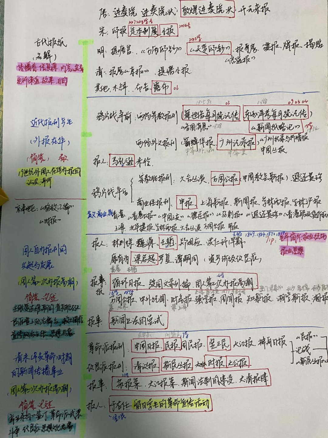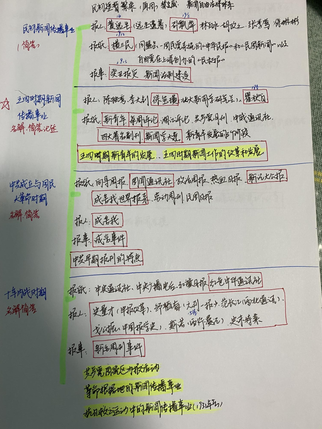 第二轮(6月-9月) 第二阶段要花费时间开始背书,每天可分配4-5小时,可以根据第一阶段做好的框架进行记忆,同时可以补充一些进阶类的书目完善框架,尤其是根据暨大近两年的出题风格,会考察一些理论溯源,考生不应仅仅局限于最基础的书目。 另外这个阶段可以开始练习论述题,尽量用手写。除此之外,在此阶段可以开始总结专题,例如:媒介技术、马克思主义新闻观、国际传播、媒介融合、媒介文化、融合新闻、疫情、舆论等专题,此阶段考生需要做的工作比较多。 暑期结束之前最好可以结束第一轮背诵,每天背书时间4-6个小时。7月左右,每一本书的框架要做好。同时要开始整理专题,专题是答论述题的基础。 Tip1:背书的两种方式:1.直接背笔记 2.一手拿框架,一手拿笔记,推荐第二种,框架要印在脑子里,不会的看书; Tip2:关于背书心态:背完就忘是常态,背书没有捷径,只有反复背,推荐用艾宾浩斯记忆曲线。 一边背书,一边练题,把历年真题打印出来练习,输出要配合输入。真题的作用:指引你背书的方向,根据真题感知重点。每周至少练习一道论述题,万事开头难,练的越早越好,但要注意,不要陷入“自说自话”。 中期需要开始看老师的论文,近两年真题中许多题目都来源于老师论文,尤其要注意!!! 另外,建议关注热点事件,联系理论。 特别提及关于中新史的记忆技巧:根据时间线,记忆报人、报纸、报事。另外要根据 真题把中新史的考场重点找出来重点记忆。 Tip1:方法很关键,避坑指南:第一年我中新史记忆占用了专业课的一半时间,最后还是没记住,原因在于没有根据时间线梳理,也就是说框架大于细节,你只要知道每个时期有哪些报人办了哪些报纸,并且配合政治近代史纲要一起学习,明确每个时期的历史事件,考试围绕此进行答题(编)就行 Tip2:暑期是考研的关键节点,有人说只要抓住了暑假,你就赢了一半,不无道理,暑假是集中学习的时间段,建议在校备考。 Tip3:建议用答题纸作答,答题区域B5大小,熟能生巧。(答题纸pdf,直接去某宝打印即可)